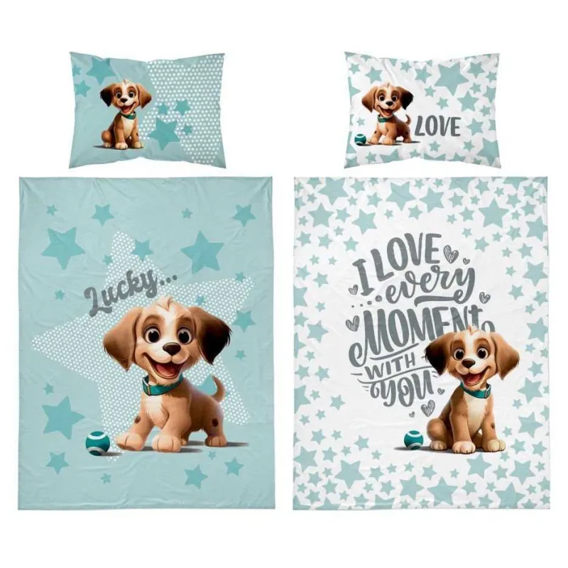 Bambusové povlečení do postýlky  VESELÝ PEJSEK oboustranné, světle tyrkysové 100x135, 40x60 4784B