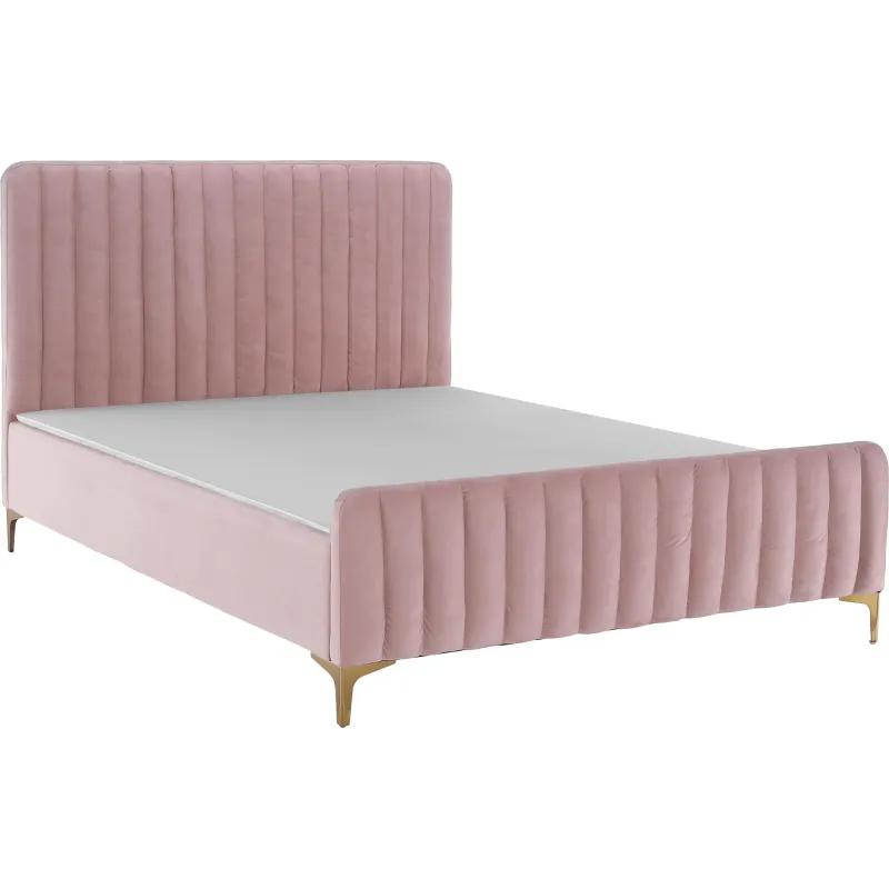 Postel KAISA 160x200 je dokonalým spojením elegance, komfortu a moderního designu. Jemná růžová Velvet látka působí luxusně a příjemně na dotek, zatímco kovové nohy v provedení gold chrom dodávají posteli nádech glamour stylu.