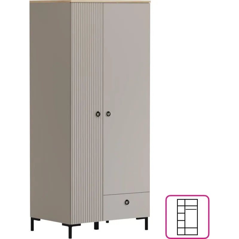 Promyšlené vnitřní uspořádání nabízí police, věšákovou tyč a zásuvku, díky čemuž máte vše přehledně uspořádané a vždy po ruce. Skříň tak poskytuje dostatek prostoru jak pro zavěšené oblečení, tak pro složené kusy či doplňky.