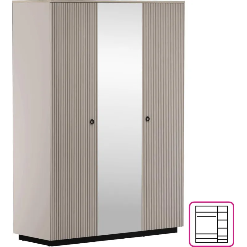 Dominantním prvkem skříně je velké zrcadlo, které nejen opticky zvětší prostor, ale zároveň vám usnadní každodenní přípravu. Promyšlené vnitřní uspořádání nabízí police, věšákovou tyč a dvě zásuvky, díky čemuž získáte dostatek místa pro oblečení i doplňky.