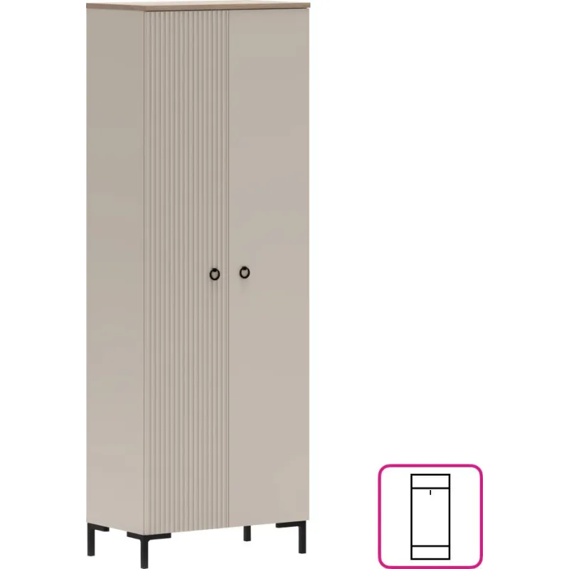 Skříň zaujme nejen svým designem, ale i praktickým vnitřním uspořádáním. Nabízí dostatek prostoru v podobě polic a výsuvné věšákové tyče, což umožňuje přehledné uložení oblečení i doplňků. Velkou výhodou jsou univerzální dvířka, která lze namontovat podle potřeby na pravou nebo levou stranu.